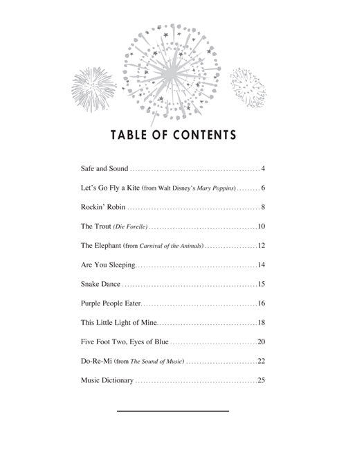 Faber Studio Collection Selections from PlayTime® Piano Level 1 Publisher: Faber Piano Adventures Category: Educational Keyboard Series: Faber Piano Adventures® Format: Paperback PlayTime® Studio Collection offers a spectacular array of favorite pieces from the PlayTime® Piano Supplementary Library. Level 1 students will be motivated to showcase their skills while playing familiar pieces arranged at precisely the right level. Songs include: Do-Re-Mi · The Elephant · Five Foot Two, Eyes of Blue (Has Anybody Seen My Girl?) · Frere Jacques (Are You Sleeping?) · Let's Go Fly a Kite · Purple People Eater · Rockin' Robin · Snake Dance · This Little Light of Mine · The Trout · Plus special bonus hit Safe and Sound! View Helpful Introductory Videos Here (https://www.youtube.com/playlist?list=PLROQq1cZUMn9XB6nBAHckOvPSOhJFN_Fx) Inventory # : 00119433 UPC: 884088909253 ISBN: 1616776412 Width: 9" Length: 12" Height: 0.071" Product Weight: 0.2 lbs. Number of Pages: 24