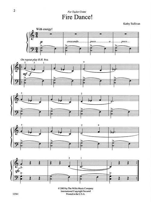 Description: Fire Dance! is a lively, rhythmical piece written in the key of C minor. It's a real audience pleaser! Purpose: *Practice in dynamic changes. *Challenges student to maintain a steady tempo. *Learning to convey an emotion or mood through the music. Suggestions for Instruction: Begin by identifying all dynamic markings, visualizing how the song will flow dynamically. Be sure the LH does not overpower the RH melody. And as always, practice slowly and carefully. Challenge yourself to play with zero mistakes! Key: C minor