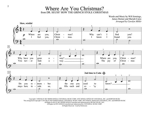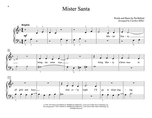 Eight popular Christmas favorites arranged at an elementary level for budding pianists: All I Want for Christmas Is My Two Front Teeth · The Chipmunk Song · Feliz Navidad · Grandma Got Run over by a Reindeer · A Holly Jolly Christmas · Mister Santa · Somewhere in My Memory · Where Are You Christmas?