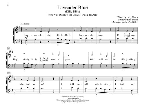 Eight Disney solos perfect for the elementary-level piano student. Excellent supplements to any piano method. Also includes lyrics! Songs: Beauty and the Beast · Chim Chim Cher-ee · Friend Like Me · Hakuna Matata · Lavender Blue · Les Poissons · Reflection · You Can Fly! You Can Fly! You Can Fly!