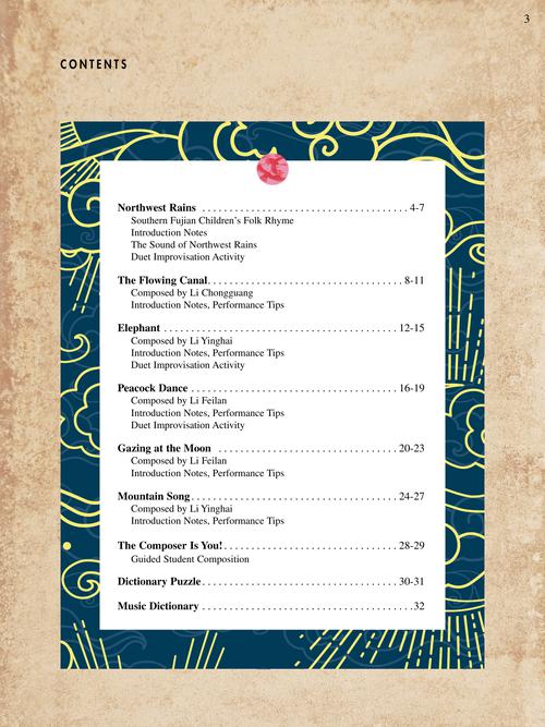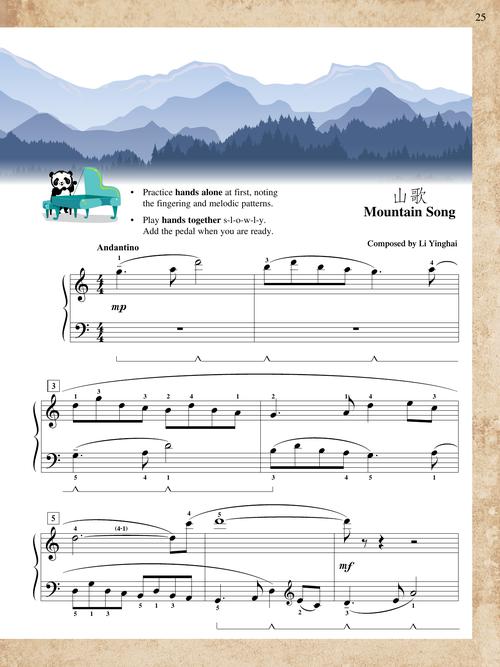 FunTime Piano Music from China is a special collection of folk songs and original Chinese works arranged for early intermediate students (Level 3A-3B). These pieces offer dance-like rhythms, dramatic movement across the keyboard, sonorous use of the pedal, and fast tempi with crisp articulations. Music and text explore fascinating aspects of China such as flowing canals, majestic elephants, peacock dances, mooncakes, and mountain songs. The delightful character LeLe the panda lends a paw with questions for interpretation, and students create their own Chinese sounds in improvisation and composition activities. Songs include: Elephant · The Flowing Canal · Gazing at the Moon · Mountain Song · Northwest Rains · Peacock Dance.