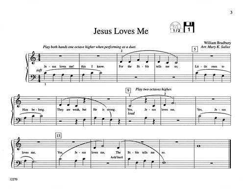 11 hymns: Amazing Grace · Faith of Our Fathers · For the Beauty of the Earth · Holy, Holy, Holy · Jesus Loves Me · Jesus Loves the Little Children · Joyful, Joyful, We Adore Thee · Kum bah yah · Praise Him, All Ye Little Children · We Are Climbing Jacob's Ladder · What a Friend We Have in Jesus.