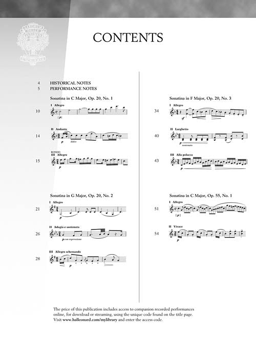 Included in this volume are seven well-known sonatinas appropriate for intermediate level pianists. Recordings of each piece can be accessed online using the unique code in the book. Contents: Sonatina in C Major, Op. 20, No. 1 · Sonatina in G Major, Op. 20, No. 2 · Sonatina in F Major, Op. 20, No. 3 · Sonatina in C Major, Op. 55, No. 1 · Sonatina in G Major, Op. 55, No. 2 · Sonatina in C Major, Op. 55, No. 3 · Sonatina in A Minor, Op. 88, No. 3