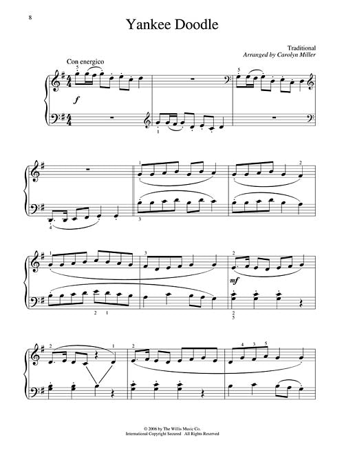 10 songs of American pride for developing pianists, including: America, the Beautiful · Battle Hymn of the Republic · The Caissons Go Rolling Along · Marine's Hymn · Star Spangled Banner · Stars and Stripes Forever · Yankee Doodle · and more.