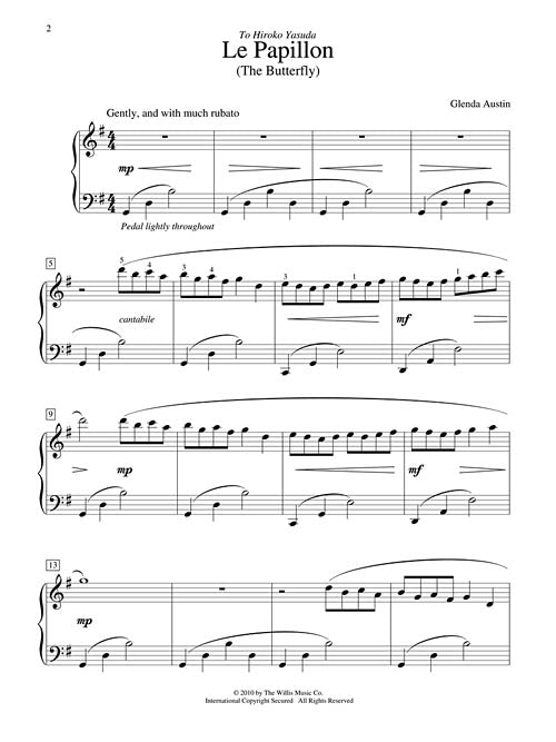 Le Papillon (The Butterfly) National Federation of Music Clubs 2014-2016 Selection Early Intermediate Level Publisher: Willis Music Category: Educational Keyboard Series: Willis Format: Paperback A remarkably beautiful piece depicting the transformation of a butterfly. Expressive and delicate. Key: G Major. To see other NFMC selections, click here (http://www.halleonard.com/promo/promo.do?promotion=183) . Inventory # : 00416873 UPC: 884088512804 ISBN: Width: 9" Length: 12" Height: 0.025" Product Weight: 0.1 lbs. Number of Pages: 8