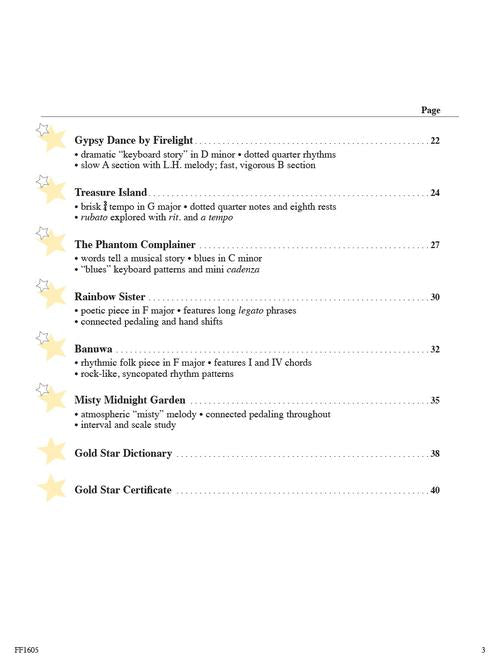 An adventurous collection for the late-elementary student that offers performance pieces with a challenge. These are especially appropriate for recitals and other musical events, featuring an ancient Chinese folk song, a gypsy dance by fire light, and a humorous blues piece. These new solos by the Fabers provide settings in harmony, style, and rhythm that explore the expressive and dramatic qualities of the piano. Includes access to online audio for both listening and play-along. Titles include Festive Sonatina · Tijuana Tambourine · Treasure Island · and The Phantom Complainer. Audio is accessed online using the unique code inside the book and can be streamed or downloaded. The audio files include PLAYBACK+, a multi-functional audio player that allows you to slow down audio without changing pitch, set loop points, change keys, and pan left or right.