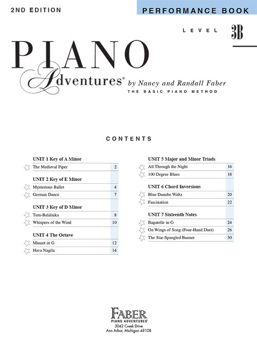 The 2nd Edition of the 3B Performance Book offers appealing, pianistic pieces that closely correlate with the Lesson Book concepts. Students will enjoy a German Dance by Beethoven and a selection from the Notebook for Anna Magdalena Bach, as well as arrangements by Strauss, and a four-hand duet by Felix Mendelssohn. Well-loved standards such as Hava Nagila and The Star-Spangled Banner, along with new originals by the Fabers, provide a variety of major and minor keys, accompaniment styles, and pianistic expression.