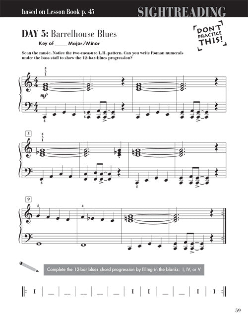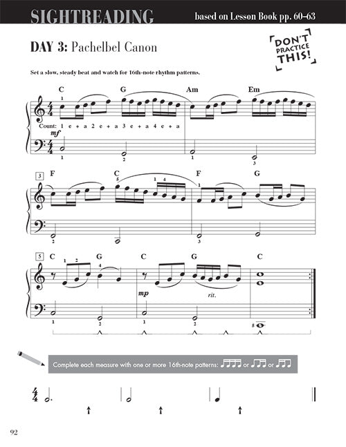 As the music becomes more complex, an initial scanning of the music is greatly encouraged: Is the key in major or in the relative minor? Spot the rhythm pattern used throughout. Plan how you will play the last arpeggiated chord. Students gain experience in C and Am, G and Em, F and Dm. Concepts extend to chord inversions, the octave, and 16th note patterns. Occasional Rhythm Road exercises invite tapping and writing work.