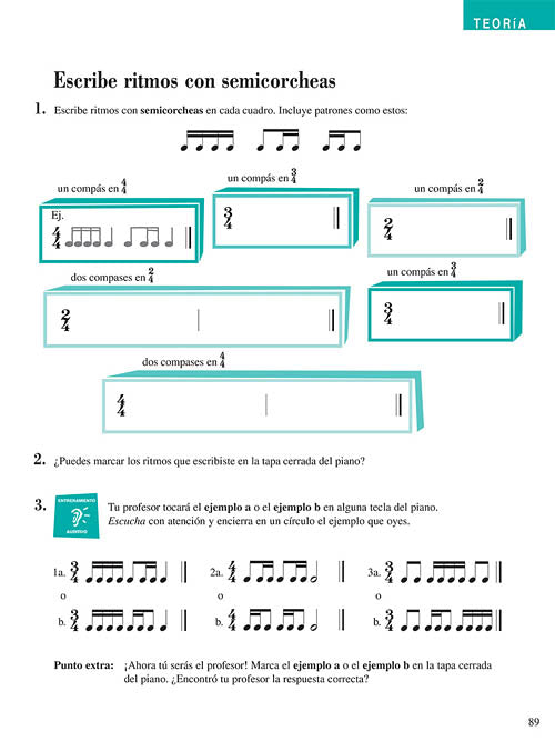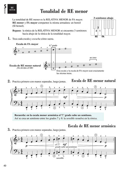 El Libro de lecciones y teoría del Nivel 5 explora las escalas mayores y menores a profundidad. Las líneas adicionales extienden el rango de lectura. Los distintos patrones rítmicos de semicorcheas preparan a los estudiantes para el repertorio pianístico de nivel intermedio. Los compases compuestos se introducen en este nivel junto con los tresillos y el ritmo de swing. Los estudiantes aprenden a reconocer el intervalo de 7.a y exploran su uso tanto en un contexto de armonía tradicional como en estilo jazz. The Level 5 Lesson and Theory Book explores the major and minor scales in depth. Ledger lines extend the reading range. The different rhythmic patterns of sixteenth notes prepare students for intermediate piano repertoire. Compound time signatures are introduced at this level, along with triplets and swing rhythm. Students learn to recognize the interval of a 7th and explore its use both in the context of traditional harmony and jazz styles.