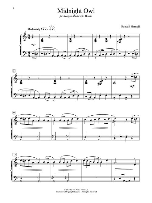 Hartsell's Midnight Owl imagines an enchanting bird who likes to swing dance in the middle of the night. The catchy melody takes place mostly in the bass clef, which may help strengthen a weak left hand. The I-IV-I-V7-I progression in A Minor is also introduced.