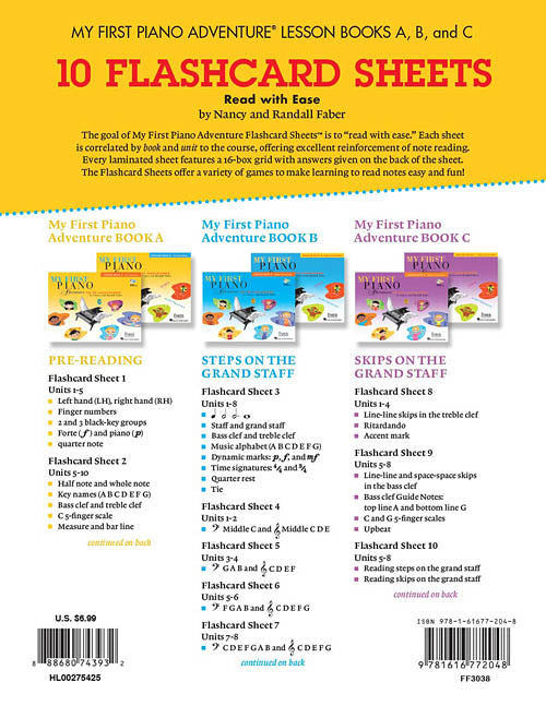 This set of ten flashcard sheets provides interactive fun to help students read with ease. Each sheet is correlated by book and unit to the My First Piano Adventure course, offering excellent reinforcement of note reading and music concepts. Every laminated sheet features a 16-box grid with answers printed on the back. Included are a variety of games and activities for individual and group lessons.