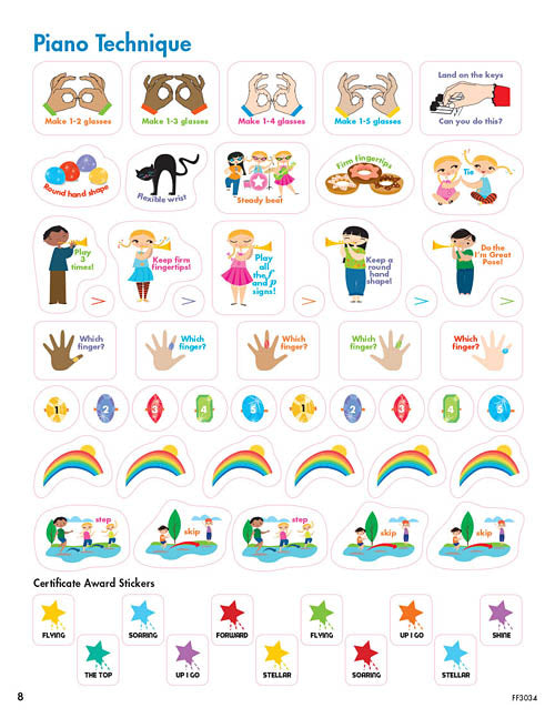 Build confidence and celebrate progress with lessons that really stick! The My First Piano Adventure Sticker Book contains over 400 Stickers That Teach. All your friends at the piano are here with musical questions and prompts, making each sticker a miniature opportunity for playful review. Reinforce topics of the keyboard, rhythm, treble and bass clefs, piano technique, and composers. Have fun with themes for every season including friends, animals, snacks, travel, holidays, and more. Also included are dozens of award stickers specially designed for the final certificate page in Lesson Books A, B and C. As students complete each piece, they build their certificate, sticker by sticker, in recognition of the steps along their musical journey.
