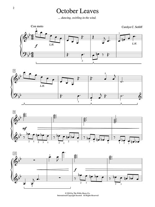 October leaves ... dancing, swirling, in the wind. An excellent solo that suits the title perfectly! Chromatic scales and hand-over-hand arpeggios up and down the keyboard make the piece sound more difficult than it is, and the patterns help with memorizing. Key: G Minor.