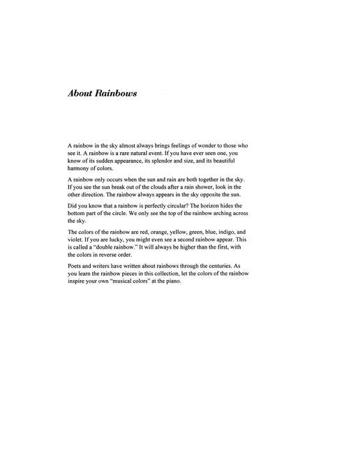 Written for the mid to late elementary piano student, the focus on the tone color and interpretation fosters musical growth while developing technical facility at the keyboard. The pieces are ideal for recital, festival, or personal enjoyment. Each piece includes a short creative opportunity to inspire the student's composing talent. Also included at the end of the book is an optional composing project. Titles include: I Love a Rainbow · Purple Rainbow Swirls · Rainbow in My Pocket · Rainbow Dreams · Rainbow Ice Cream · Walk in a Rainbow.
