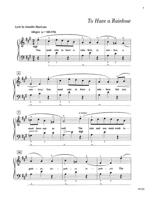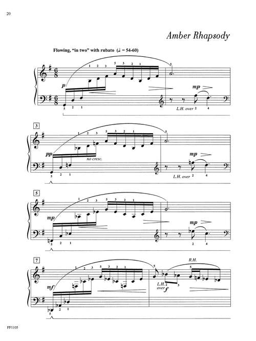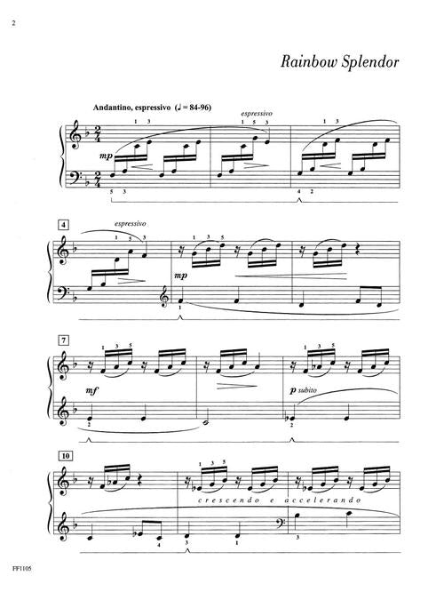This book completes the three-book series. Teachers will appreciate the development of phrase shaping, extended crescendos and diminuendos, subito piano and rubato playing, fluid two-hand gestures, and artistic pedaling. The pieces are ideal for recital and festival as well as personal enjoyment. Contents include: Rainbow Splendor · To Have a Rainbow · Shimmering Waterfalls · Valse Indigo · Crystalline Rag · Amber Rhapsody.