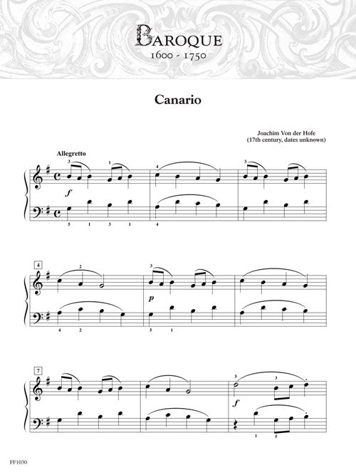 This collection of 21 authentic keyboard works represents the major periods of music - from Baroque to Contemporary - and serves as an excellent introduction to classical keyboard literature. Demo audio tracks are accessed online. Contents: VON DER HOFE: Canario · PRAETORIUS: Procession in G · TELEMANN: Gavott in C · MOURET: The Highlander · HOOK: Bagatelle · Minuet · TURK: Little Dance · DIABELLI: Morning · HAYDN: Quadrille · ATTWOOD: Sonatina in G · J.C. BACH: Adagio and Allegro · SCHYTTE: Little Prelude · Melody for Left Hand · SPINDLER: Two Preludes · WOHLFAHRT: Waltz for Four Hands · GURLITT: The Hunt · LYNES: Tarantella · ALT: On the Ocean Floor · DUBLIANSKY: The Busy Machine · SALUTRINSKAYA: Shepherd Pipes · FABER: Pantomime