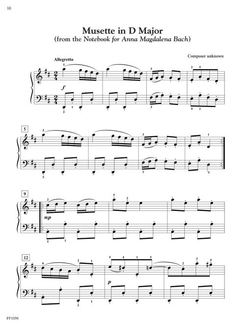 Consists of carefully selected repertoire from the Baroque, Classical, Romantic, and Modern periods with audio demos provided. Contents: KRIEGER: Minuet in A minor · DUNCOMBE: Fanfare in C Major · LULLY: Minuet in D minor · ANNA MAGDALENA BACH NOTEBOOK: Musette in D Major · Minuet in G Major · Minuet in G minor (PETZOLD) · March in D Major (C.P.E. BACH) · J.C. BACH: Solfeggio in D Major · GOSSEC: Tambourin · HASLINGER: Sonatina in C Major · HAYDN: German Dance in D Major · Minuet in G Major · Allegro in F Major · CLEMENTI: Sonatina in C Major, Op. 36, No. 1 · DIABELLI: Sonatina in G Major, 1st Movement, Op. 168, No. 2 · Rondo for Four Hands, Op. 163, No. 6 · BEETHOVEN: Two German Dances · LEOPOLD MOZART: Allegro in A Major · GURLITT: A Little Flower · BURGMULLER: Arabesque, Op. 100, No. 2 · Ballade, Op. 100, No. 15 · Harmony of the Angels, Op. 100, No. 21 · SCHUMANN: Wild Rider, Op. 68, No. 8 · Melody, Op. 68, No. 1 · ELLMENREICH: Spinning Song, Op. 14, No. 4 · HELLER: Avalanche, Op. 45, No. 2 · REINECKE: Gavotte, Op. 183, No. 1 · REBIKOV: Chinese Figurine · Playing Soldiers, OP. 31, No. 4 · FABER: The Moons of Jupiter · MCKAY: Song of the Range Rider · Cowboy Song · JACOBY: Sonatina