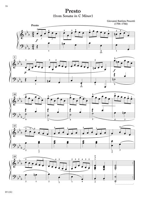 The Developing Artist Piano Literature Book 4 is a collection of authentic keyboard literature, complete with demonstration audio, for the late-intermediate pianist. The book consists of carefully selected repertoire from the Baroque, Classical, Romantic, and Contemporary periods. Historical text on the major periods of music history is presented at the beginning of the book. This series complements The Developing Artist Piano Sonatinas Books 1 - 4. Contents: BACH: Bourree in E minor · Little Prelude in C Major, BWV 939 · Little Prelude in F Major, BWV 927 · Musett in G Major (Gavotte II from English Suite No. 3, BWV 808) · Prelude in C Major · BUTTSTEDT: Minuet in D minor · GRAUPNER: Intrada · PESCETTI: Presto · SCARLATTI: Folia · C.P.E. BACH: Solfeggietto · W.F. BACH: Allegro in A Major · BEETHOVEN: Fur Elise · Minuet in G Major, WoO 10, No. 2 · BENDA: Sonatina in A minor · CLEMENTI: Sonatina in G Major, OP. 36, No. 2 · HAYDN: Concerto in C · KUHLAU: Sonatina in C Major, OP. 55, No. 1 · BEACH: Canoeing, Op. 119, No. 3 · BURGMULLER: L'Orage, Op. 109, No. 13 · CHOPIN: Mazurka in F Major, OP. 68, No. 3 · Prelude in B minor, OP. 28, No. 6 · Prelude in E minor, Op. 38, No. 4 · Waltz in A minor · FIBICH: Adagio and Furiant · GRIEG: Sailor's Song, Op. 68, No. 1 · Watchman's Song, Op. 12, No. 3 · GURLITT: Miniature · Scherzo in D Minor · TCHAIKOVSKY: Sweet Dream, Op. 39, No. 21 · FABER: Ride of Pegasus · Winter Painting · MCKAY: Bronco Bill · Distant Sierras · REBIKOV: Dance with a Bell · In the Forest, OP. 51, No. 4 · ROSSI: Giant Purple Butterflies