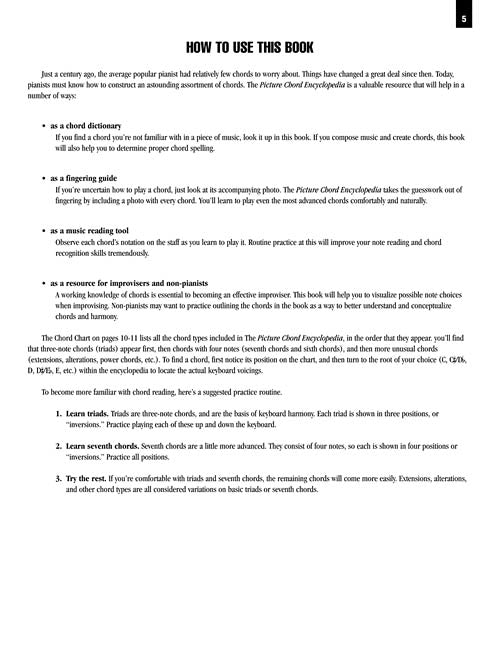 Weighing in with nearly 400 pages, the Picture Chord Encyclopedia is the most comprehensive keyboard resource ever! It includes easy-to-see photos, easy-to-read chord diagrams and treble and bass clef notation for over 1,600 keyboard chords, plus basic chord theory, a chord symbol chart, and more! Also available in a 6 inch. x 9 inch. Edition (00310978).