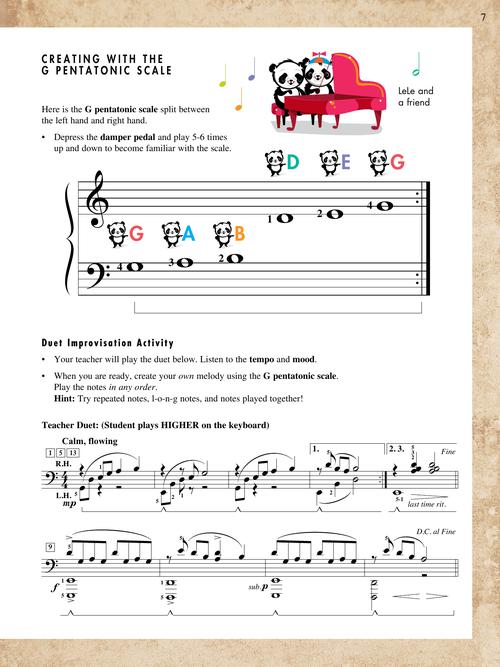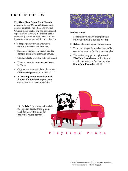 PlayTime Piano Music from China is a musical journey featuring energetic dances, quiet folk melodies, and original Chinese pieces. The book is arranged especially for the early elementary student and correlates with Level 1 in the Piano Adventures method. At this level, five-finger positions reinforce tonalities and intervals. Teacher duets provide a full, rich background. Along the way, students meet LeLe the musical panda, their whimsical guide to exploring the Chinese sound through discovery questions, improvisation, and composition activities. A picture tour of China, unique at each level of the series, introduces highlights of history and culture. Songs include: Fengyang Flower-Drum · Frog Dance · Let's Sing · Pouch Embroidering · Song of the Newsboy · Tune from Xinjiang · What Is the Most Beautiful.