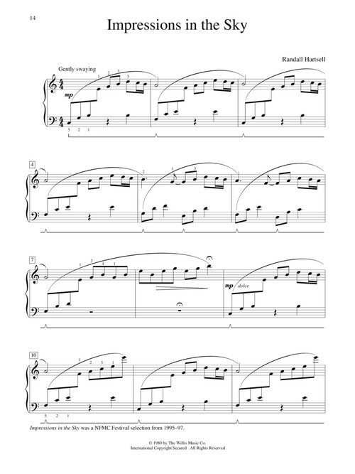 This charming solo collection for the intermediate pianist is based on the varying portraits and impressions that may be inspired by the ever-changing skies above. All the pieces lean towards the romantic, and repeated patterns in many of the pieces help make the learning process easier. A treasure trove of pieces for student recitals!