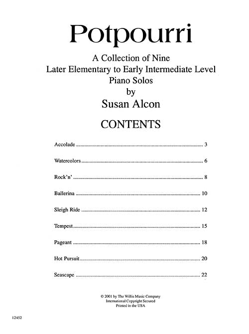A collection of truly engaging lyric and character pieces presented in a variety of stylistic settings. For use in recital, festival or simply for enjoyment. Student favorites include Watercolors, Ballerina, Pageant, Hot Pursuit and Seascape.