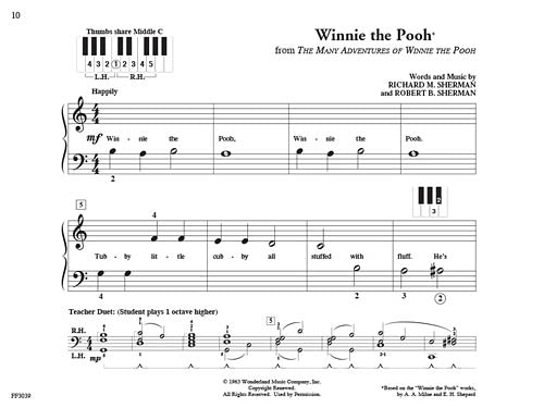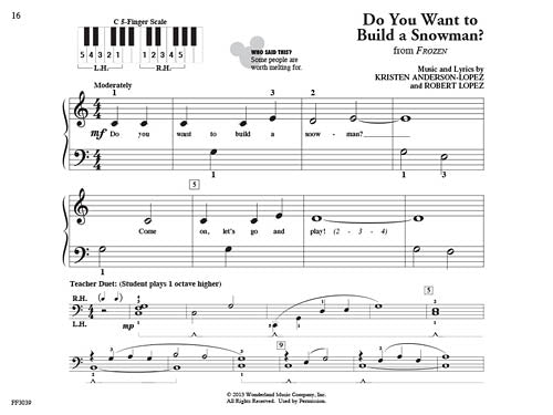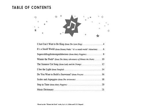 PreTime Piano Disney offers an exciting set of contemporary and classic Disney favorites arranged for the Primer student. Motivating selections reinforce basic rhythms and beginning note reading, and optional teacher duets add vitality and color. Students will enjoy treasured songs from Frozen, The Lion King, Mary Poppins, and more. Songs include: Do You Want to Build a Snowman? (Frozen) · I Just Can't Wait to Be King (The Lion King) · I See the Light (Tangled) · It's a Small World · Scales and Arpeggios (The Aristocats) · The Siamese Cat Song (Lady and the Tramp) · Step in Time (Mary Poppins) · Supercalifragilisticexpialidocious (Mary Poppins) · Winnie the Pooh.