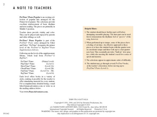 PreTime® Piano Popular Primer Level Publisher: Faber Piano Adventures Category: Educational Keyboard Series: Faber Piano Adventures® Format: Softcover Arrangements of popular songs that beginning players will love to learn, including: The Candy Man · I Just Can't Wait to Be King · If I Only Had a Brain · Scooby Doo Main Title · and more. View Helpful Introductory Videos Here (https://www.youtube.com/playlist?list=PL903AD4D345555133) Inventory # : 00420151 UPC: 674398200962 ISBN: 1616770422 Width: 9" Length: 12" Height: 0.068" Product Weight: 0.2 lbs. Number of Pages: 20