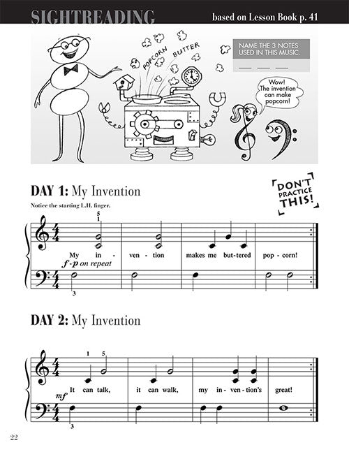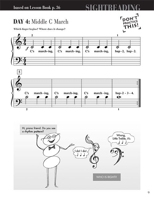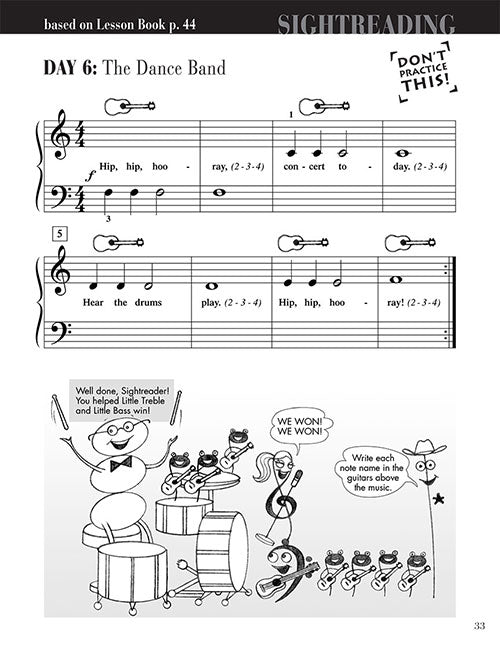 This inventive sightreading course uses sets of exercises based on melodic and rhythmic patterns from the 2nd Edition Primer Lesson Book. Students play one exercise a day, completing one set per week. Entertaining musical art helps guide the sightreading process and each page presents a new learning vignette in a spirit of fun.