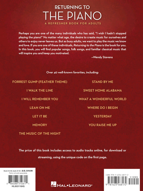 Ever think to yourself, I wish I hadn't stopped playing the piano? If so, then this is the perfect book to help you dive back into the fun world of creating music! It allows you to play the songs you know and love, from pop tunes to folk songs to familiar classical music. 44 songs include: Amazing Grace · Eine Kleine Nachtmusik · Forrest Gump - Main Title (Feather Theme) · I Walk the Line · Jesu, Joy of Man's Desiring · Let It Be · The Music of the Night · Stand by Me · Sweet Home Alabama · Twinkle, Twinkle Little Star · and many more! The book includes access to professional recordings of each song with backing tracks for practice and play-along. The audio is accessed online using the unique code inside each book and can be streamed or downloaded. The audio files include PLAYBACK+, a multi-functional audio player that allows you to slow down audio without changing pitch, set loop points, change keys, and pan left or right.
