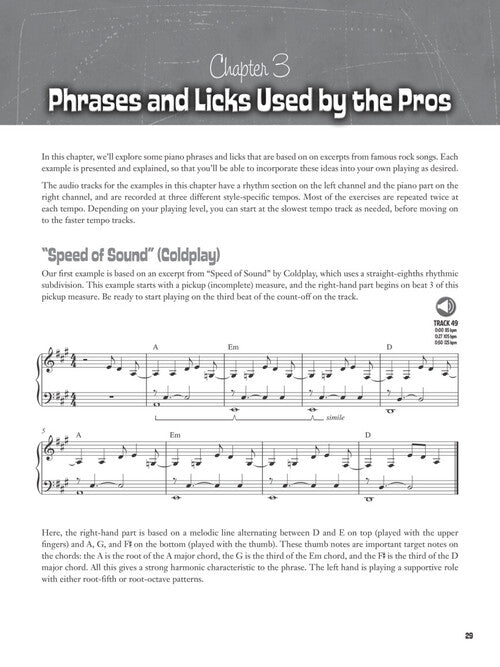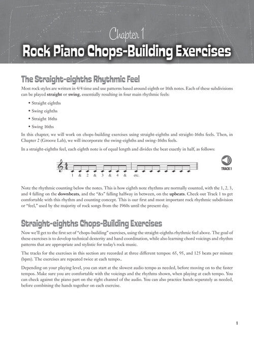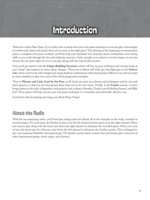 This book will give you a complete rock piano workout - in both modern and classic styles! You'll develop your rhythmic feel, dexterity, hand coordination, and voicing skills as you work through the fun, authentic examples. These pieces will help you use your rock piano technique in a musical, stylistically effective way. Each music sample is recorded at several tempos, so you can choose the one that's right for you as you play along with the rock rhythm section on the included audio files. Audio is accessed online using the unique code inside the book and can be streamed or downloaded. The audio files include PLAYBACK+, a multi-functional audio player that allows you to slow down audio without changing pitch, set loop points, change keys, and pan left or right.