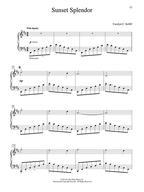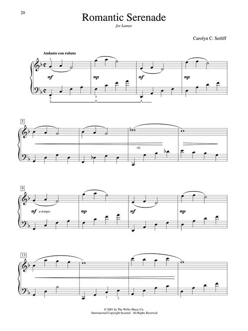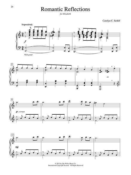 This brand-new collection features 8 romantic pieces by Carolyn C. Setliff. These lush pieces display the many faces of romance, including subtle aspects, such as a quiet gentle melody in Whispers of Dawn to stormy passion, like the expressive, tumultuous chords in Romantic Reflections and languid beauty of Intermezzo in D-flat Major. This collection also includes Setliff's popular Romantic Serenade.