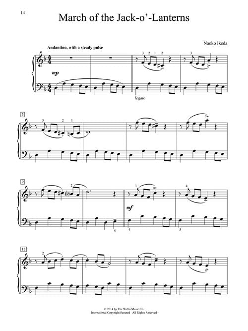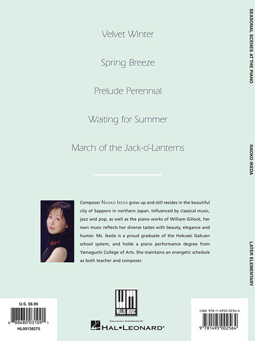 Naoko Ikeda's Seasonal Scenes at the Piano comprise of five descriptive pieces, one for each season, plus a special Prelude Perennial which can be played at at any time of the year. Each piece represents a short animated story; all are wonderful teaching pieces. Titles: Velvet Winter · Spring Breeze · Waiting for Summer · March of the Jack-o-Lanterns.