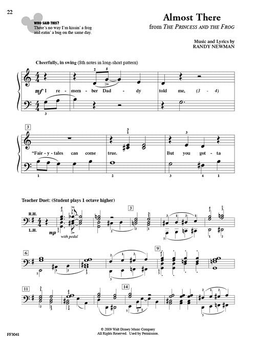 ShowTime Piano Disney presents contemporary and classic Disney hits arranged for the pianist at Level 2A. Students develop fundamental skills reading basic rhythms, intervals, and simple chords, all while playing appealing songs from favorite movies such as Aladdin, Pirates of the Caribbean, Mulan, and more. Almost There (Princess and the Frog) · Baroque Hoedown (Main Street Eletrical Parade at Disneyland® Resort and Magic Kingdom® Park) · Chim Chim Cher-ee (Mary Poppins) · Colors of the Wind (Pocahontas) · He's a Pirate (Pirates of the Caribbean: The Curse of the Black Pearl) · Proud Corazon (Coco) · Reflection (Mulan)· Under the Sea (The Little Mermaid) · A Whole New World (Aladdin.)