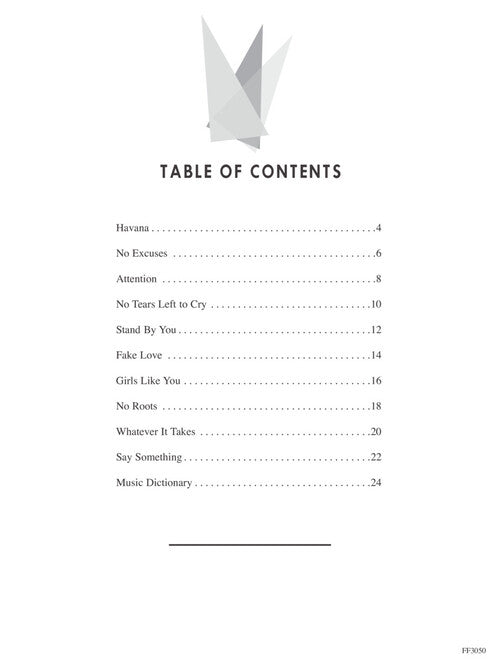 Discover a fun-filled collection of 10 popular arrangements for the elementary pianist. Play smash hits from the biggest pop stars of today, including Ariana Grande, Maroon 5, Camila Cabello, and more. The selections are arranged to provide a smooth transition for the student moving from Level 2A to 2B, with simply harmonized melodies and circled finger numbers to guide position changes. Optional teacher duets add rhythmic support and rich sound! Songs include: Attention (Charle Puth) · Fake Love (PTS) · Girls like You (Maroon 5) · No Excuses (Meghan Trainor) · No Roots (Alice Merton) · No Tears Left to Cry (Ariana Grande) · Say Something (Justin Timberlake feat. Chris Stapleton) · Stand by You (Rachel Platten) · Whatever It Takes (Imagine Dragons).