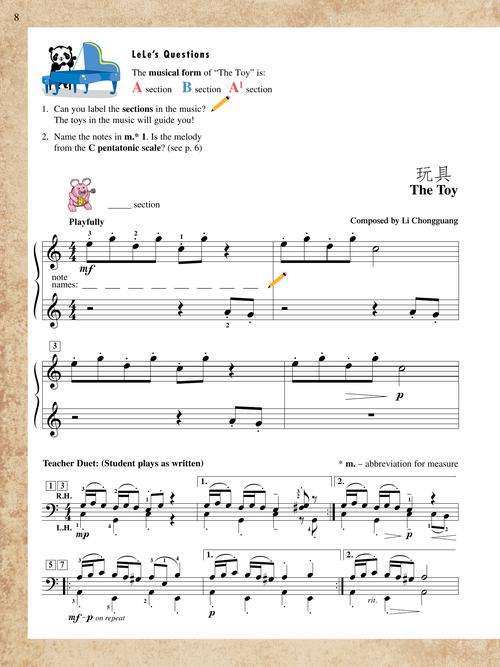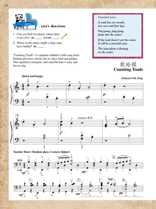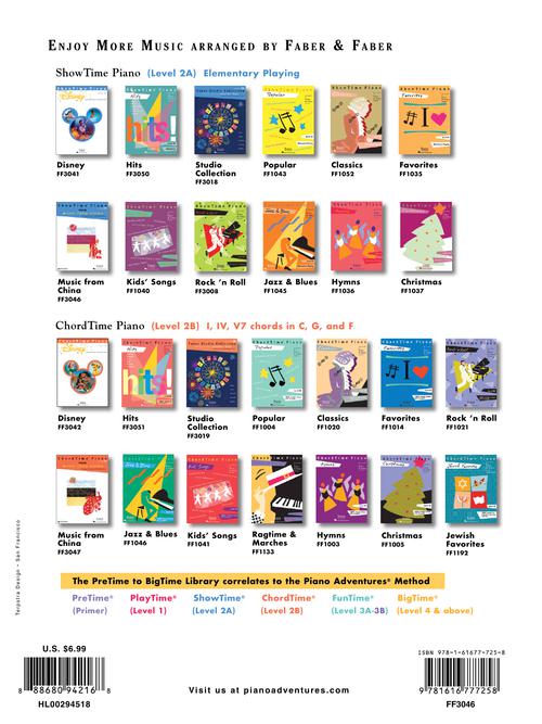 ShowTime Piano Music from China is an exciting exploration of rhythmic dances, serene folk melodies, and original Chinese selections. The book is arranged for the elementary pianist and correlates with Level 2A in the Piano Adventures method. At this level, five-finger melodies with simple harmonies reinforce tonalities and intervals, and teacher duets offer inspiration and support. Students meet LeLe the musical panda, a furry friend who asks discovery questions to guide understanding. Creatively, a duet improvisation and a composition activity introduce the Chinese sound. Unique at each level of the series is a picture tour of China, a visual snapshot of history and culture. Songs include: Counting Toads · Crescent Moon · Foot Sloggers Tune · The Game · Nine Lotus Lantern · Rainy Day · The Toy.