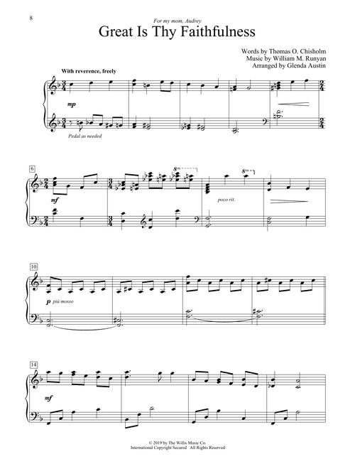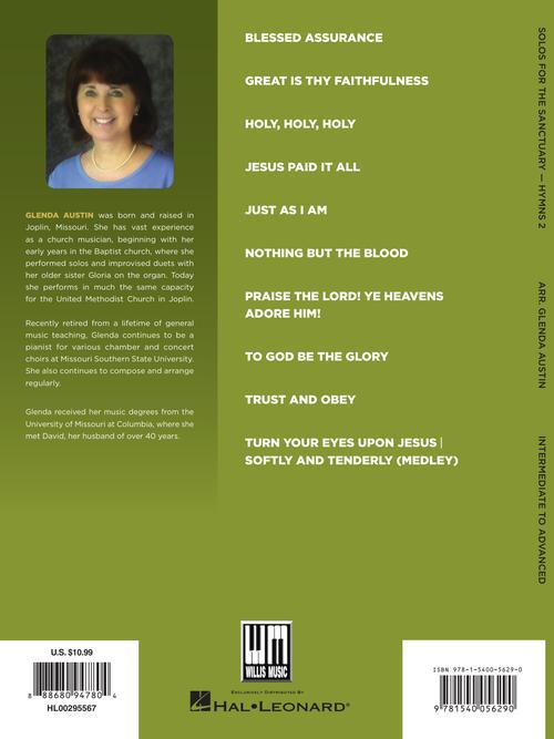 10 more gorgeous hymn arrangements from Glenda Austin! Titles: Blessed Assurance · Great Is Thy Faithfulness · Holy, Holy, Holy · Jesus Paid It All · Just As I Am · Nothing But the Blood · Praise the Lord! Ye Heavens Adore Him! · To God Be the Glory · Trust and Obey · Turn Your Eyes Upon Jesus/Softly and Tenderly (Medley).