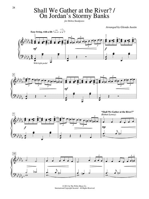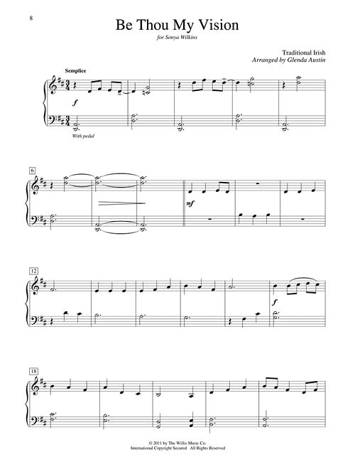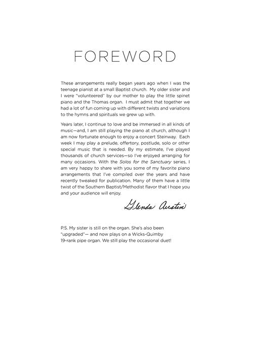 Exciting piano solos for church pianists everywhere! These excellent arrangements by Glenda Austin include some of her favorite hymns that may be used for church and recital performances, or simply for personal enjoyment. Features: Amazing Grace · Be Thou My Vision · It Is Well With My Soul · Jesus Loves Me/He Keeps Me Singing (medley) · My Jesus, I Love Thee · Shall We Gather at the River?/On Jordan's Stormy Banks (medley) · What a Friend We Have in Jesus.