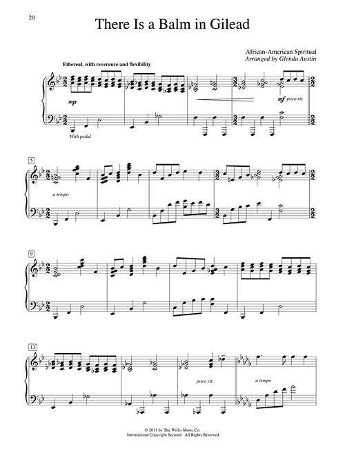Exciting piano solos for church pianists everywhere! These excellent arrangements by Glenda Austin range from highly rhythmic to lyrical and calming, and include some of her favorite spirituals. May be used for church and recital performances, or simply for personal enjoyment. Features: The Gospel Train · Joshua (Fit the Battle of Jericho) · My Lord, What a Morning · Rock-a-My Soul · Swing Low, Sweet Chariot · There Is a Balm in Gilead · Wayfaring Stranger.