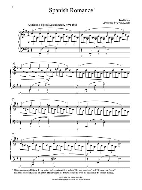 This well-loved Spanish tune exists under various titles (such as Romanza Antiqua and Romance de Amor) and is frequently heard on guitar. Levin's arrangement departs somewhat from the traditional B section melody, but preserves all its expressive qualities making it an excellent reflective piece for all ages.