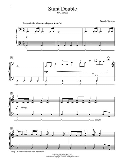 This dramatic recital-pleaser sounds big, impressive, and more difficult than it really is: perfect as a motivating piece! A steady rhythm permeates alongside a flurry of glissandos. Key: C Major.