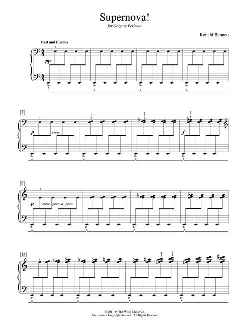 A dazzling, fast and furious showpiece that will motivate and satisfy! Like a toccata, the introductory low repeated notes/chords build massively to a rhythmic pattern that is a delight to play. Bennett utilizes a wide range of the keyboard, which makes the piece seem even more impressive. Highly recommended! Key: A Minor.