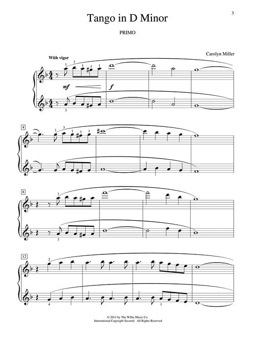 A great duet tango from Carolyn Miller! The opening bass line of the Secondo immediately calls to mind the habanera from the opera Carmen, but the duet stands on its own in terms of melodic interest and just plain old fun!