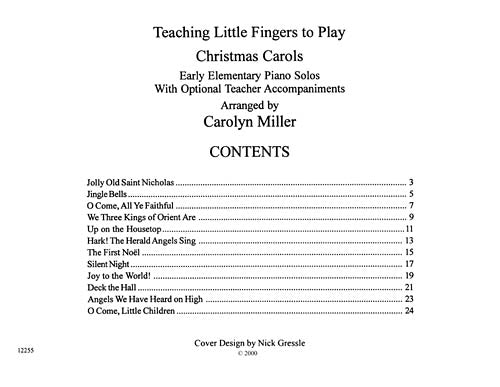 12 piano solos with optional teacher accompaniments: Angels We Have Heard on High · Deck the Hall · The First Noel · Hark! The Herald Angels Sing · Jingle Bells · Jolly Old Saint Nicholas · Joy to the World! · O Come, All Ye Faithful · O Come Little Children · Silent Night · Up on the Housetop · We Three Kings of Orient Are.