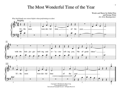 Your students will love playing these early elementary level supplements with fantastic optional teacher accompaniments arranged by Eric Baumgartner. They complement and enhance the original Teaching Little Fingers to Play method, offering important guides and reminders to reinforce musical concepts. Our Teaching Little Fingers series successfully encourages advancement and also provides delightful recital material! 9 songs, including: Blue Christmas · The Chipmunk Song · The Most Wonderful Time of the Year · Rudolph the Red-Nosed Reindeer · Silver Bells · and more.