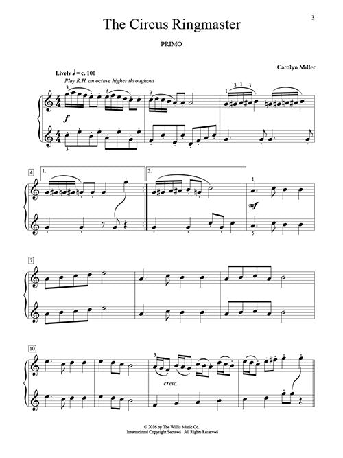 In this lively duet the melody weaves evenly between both parts before leading to a fun key change that builds to a great ending. Requirese precise fingerwork! Key: C Major, modulates to D Major.