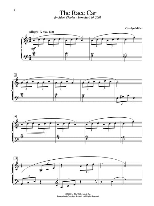 Students eager to play a fast show-offy song will delight in playing Carolyn Miller's The Race Car. This A-minor piece sounds hard, yet fits perfectly in small hands and includes repeated triplet patterns throughout. Zooms appropriately to an exciting ending.