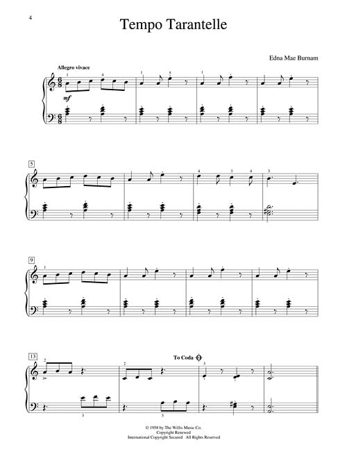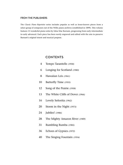 Featuring 13 whimsical (and often programmatic) piano solos by Burnam that are highly effective pianistically! These pieces, ranging from early intermediate to early advanced, have been newly engraved and edited for this unique collection: Butterfly Time · Echoes of Gypsies · Hawaiian Leis · Jubilee! · Longing for Scotland · Lovely Senorita · The Mighty Amazon River · Rumbling Rumba · The Singing Fountain · Song of the Prairie · Storm in the Night · Tempo Tarantelle · The White Cliffs of Dover.