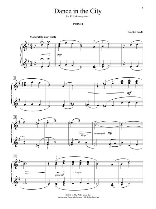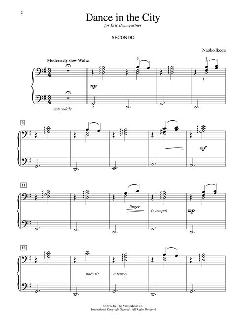Inspired by the Renoir painting La Danse a la Ville, this elegant, sublime waltz moves effortlessly between both parts. Gorgeously written and destined to be a studio favorite. Key: G Major.