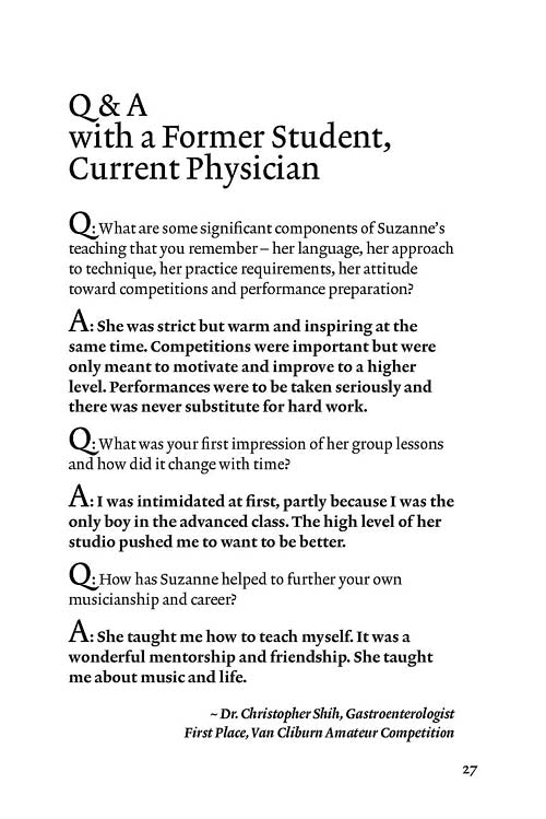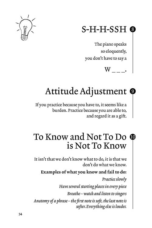 In this delightful book of reflections, Suzanne Guy shares witty sayings and wise truths gathered over 45 years of teaching piano. From daily chuckles to profound thoughts, the rich imagery and concepts presented here sparkle like musical gems, offering the perfect dose of inspiration. About the Author: Suzanne Guy has presented workshops and master classes at colleges, conventions, and professional organizations throughout the United States. Guy holds the MTNA Master Teacher Certificate and was also selected to be a Mobil Ambassador teacher at the ninth Van Cliburn Competition. Guy holds a degree in piano performance from Agnes Scott College and taught piano pedagogy at both Peabody Conservatory and George Mason University.